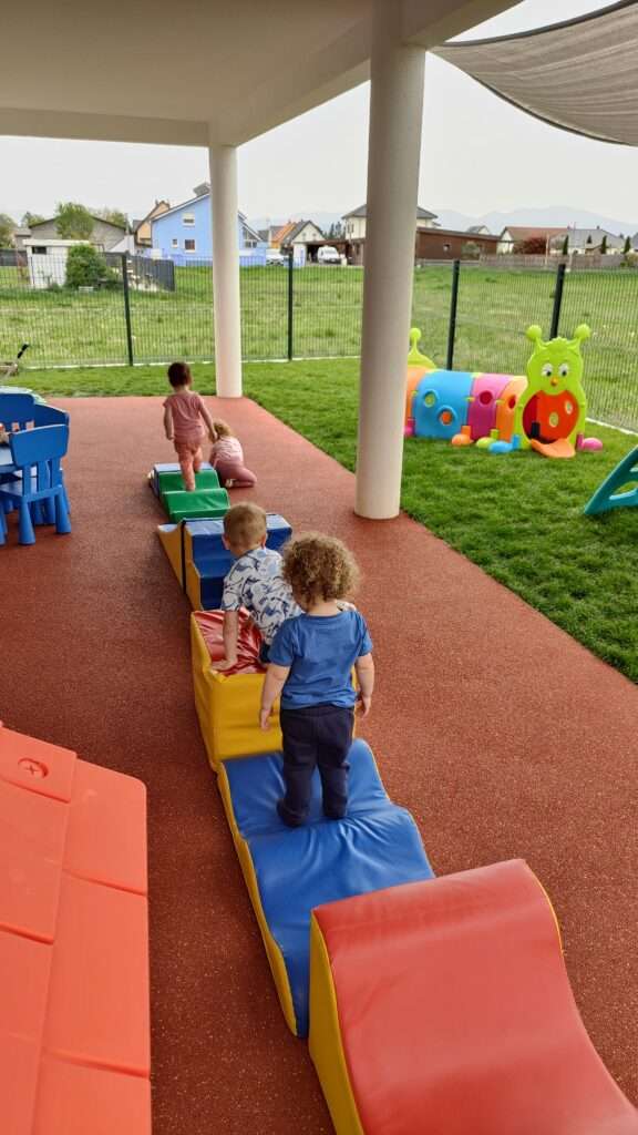 Il y a également un bel espace extérieur permettant aux enfants de courir et jouer au sein d’un espace sécurisé. Les repas et les couches sont fournis sur place.